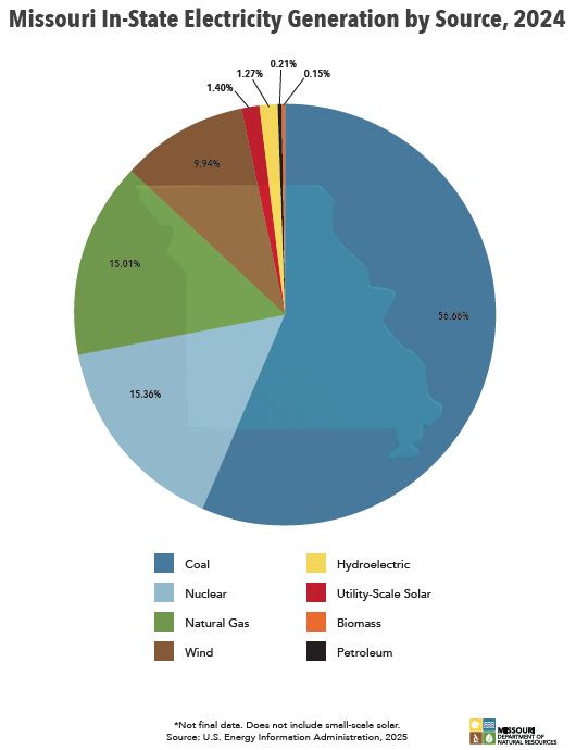 Our state is home to a diverse assortment of energy resources. Missouri’s Department of Natural Resources provides a wealth of information on our locally sourced energy. From wood to water to nuclear, we are lucky to have so many in-state options. As it relates to electricity, just fifteen years ago, our state was over 86% dependent on imported coal. Fast forward to today, we are just 56% coal dependent with a number of other local sources including solar, wind, and natural gas increasing their footprint significantly.